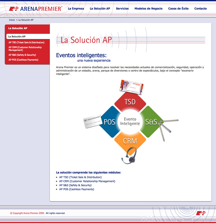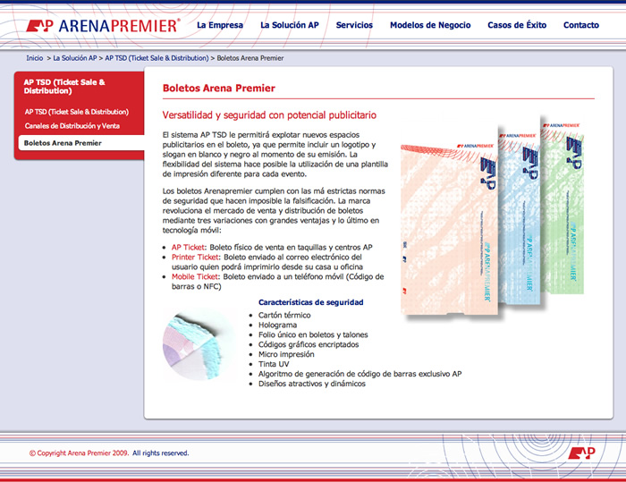 The website in the form that the screenshots reveal below was launched in March 2009. The current version can be seen at www.arenapremier.com/corporate.